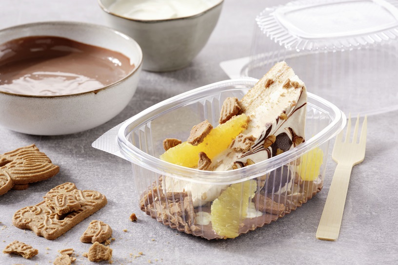 Segment the orange. Crumble the biscuits. Mix chocolate yoghurt, gingerbread spice and crème fraîche together until smooth and creamy and spoon into the to-go tray.