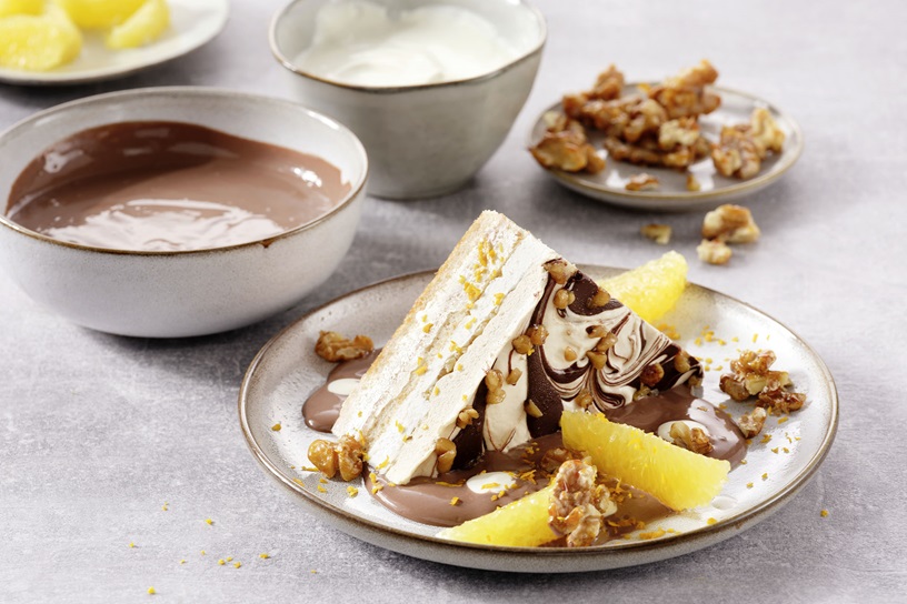 Mit Orangenfilets, karamellisierten Walnüssen und etwas frisch geriebener Orangenschale dekorieren.